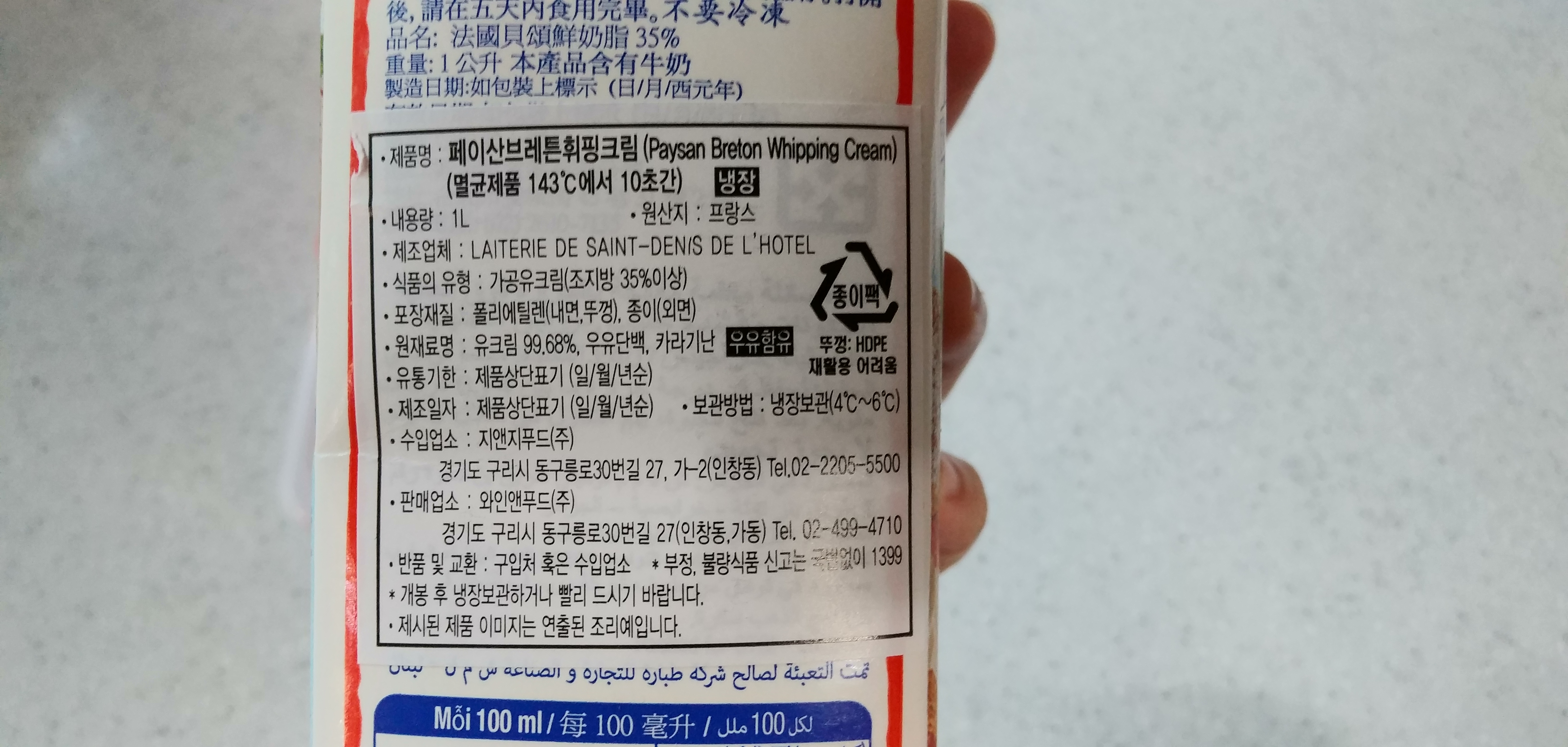 포장이 예쁘죠? 원산지는 프랑스예요. 요리와 제과에 두루두루 사용 가능한 무가당 크림입니다. 가격은 쿠팡 로켓프레시로 8천원대에 산거 같은데 현재는 로켓프레시에 안보이네요지방은 35%함유 되어있고 용량은 1L입니다원재료에 보면 유크림이 99.68% 외에 우유단백, 카라기닌이 약간 함유 되어있습니다. 냉장보관 해야하며 유크림 함량은 높으면서 유통기한도 넉넉해서 마음에 듭니다. 서울우유 100%생크림은 유통기한이 너무 짧았거든요유통기한은 이 위에 표시 되어 있어요요렇게 캡이 있어서 남은 것도 깔끔히 보관 가능해요. 열면서 저 위에 뾰족한게 캡에 달려 있어서 돌리면서 구멍이 나네요따라 보았습니다